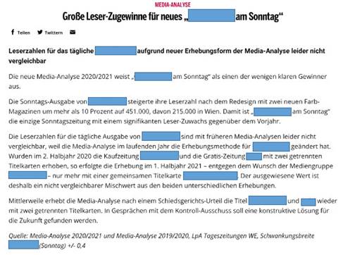 Ab der Media Analyse für 2020/21 hatte der Verein im Vergleich zu den vorangegangenen Zeiträumen seine Erhebungsmethode geändert. Folglich wurden die Mitglieder in den Richtlinien aufgefordert, dass die Daten der MA 2020/21 wegen einer Änderung der Erhebungsmethode nicht mit jenen aus vorhergehenden Jahren verglichen werden dürfen.